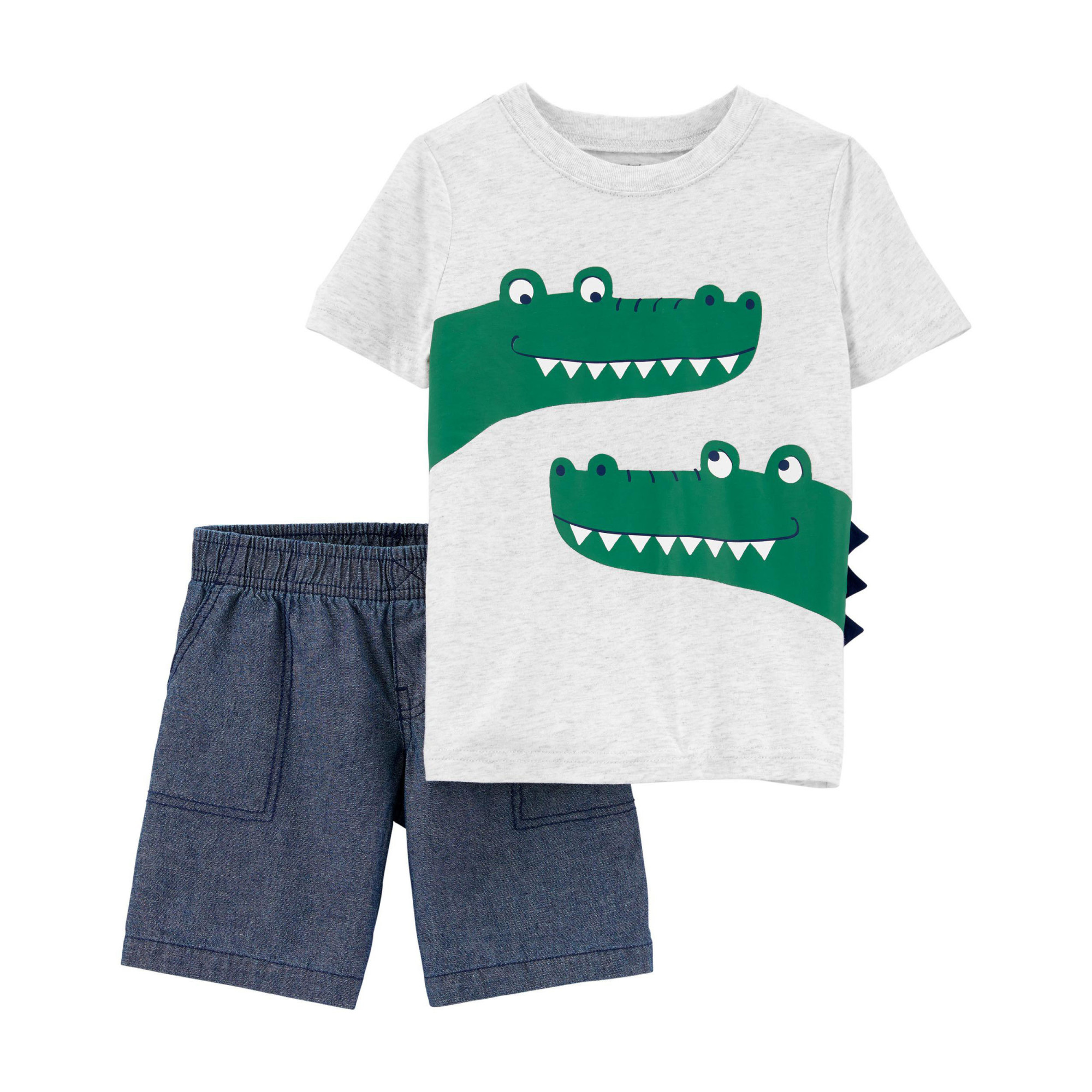 Комплект, зроблений з м'якої бавовни з принтом алігатора на футболці та 3D-шипами на шортах, ідеально підходить для вашого хлопчика! Короткі рукави, виріз в рубчик. Еластичний пояс шорт забезпечує зручну посадку. Функціональна кулиска. 100% бавовна. Можна прати в пральній машині.