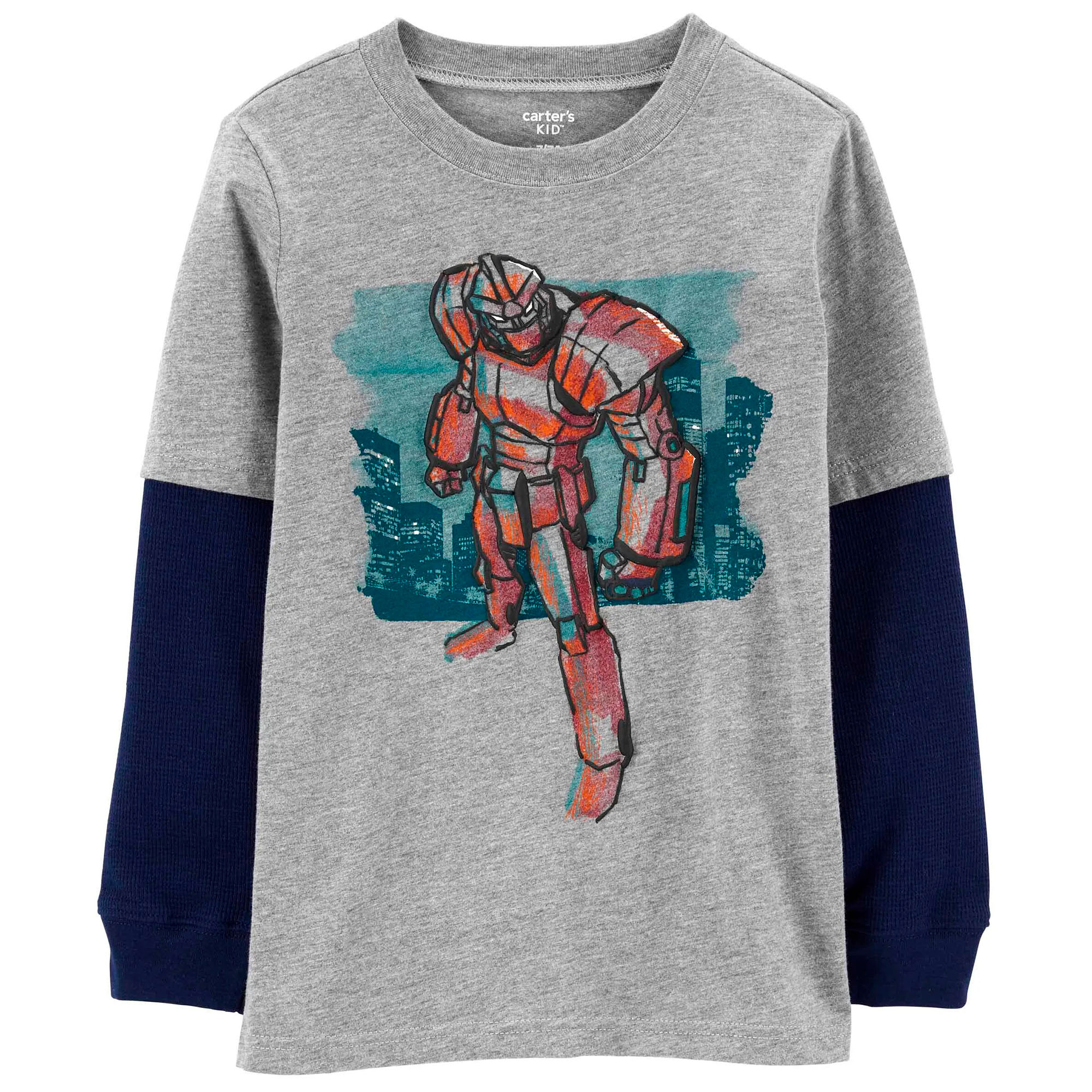 Ця симпатична футболка з довгими багатошаровими рукавами сподобається вашому хлопчику! Ребристий виріз горловини та манжети. 100% бавовняне джерсі/60% бавовни, 40% поліестеру. Можна прати в пральній машині.