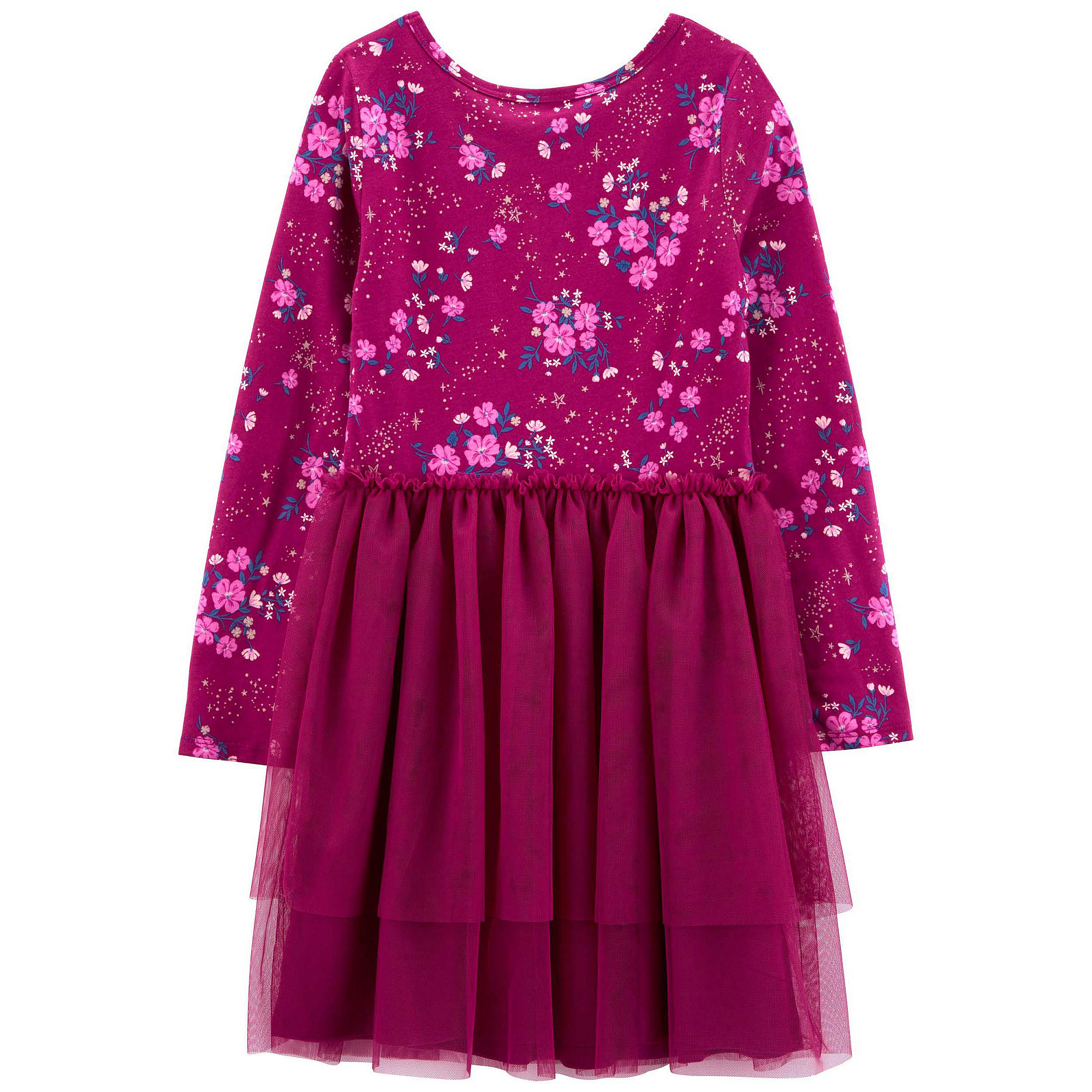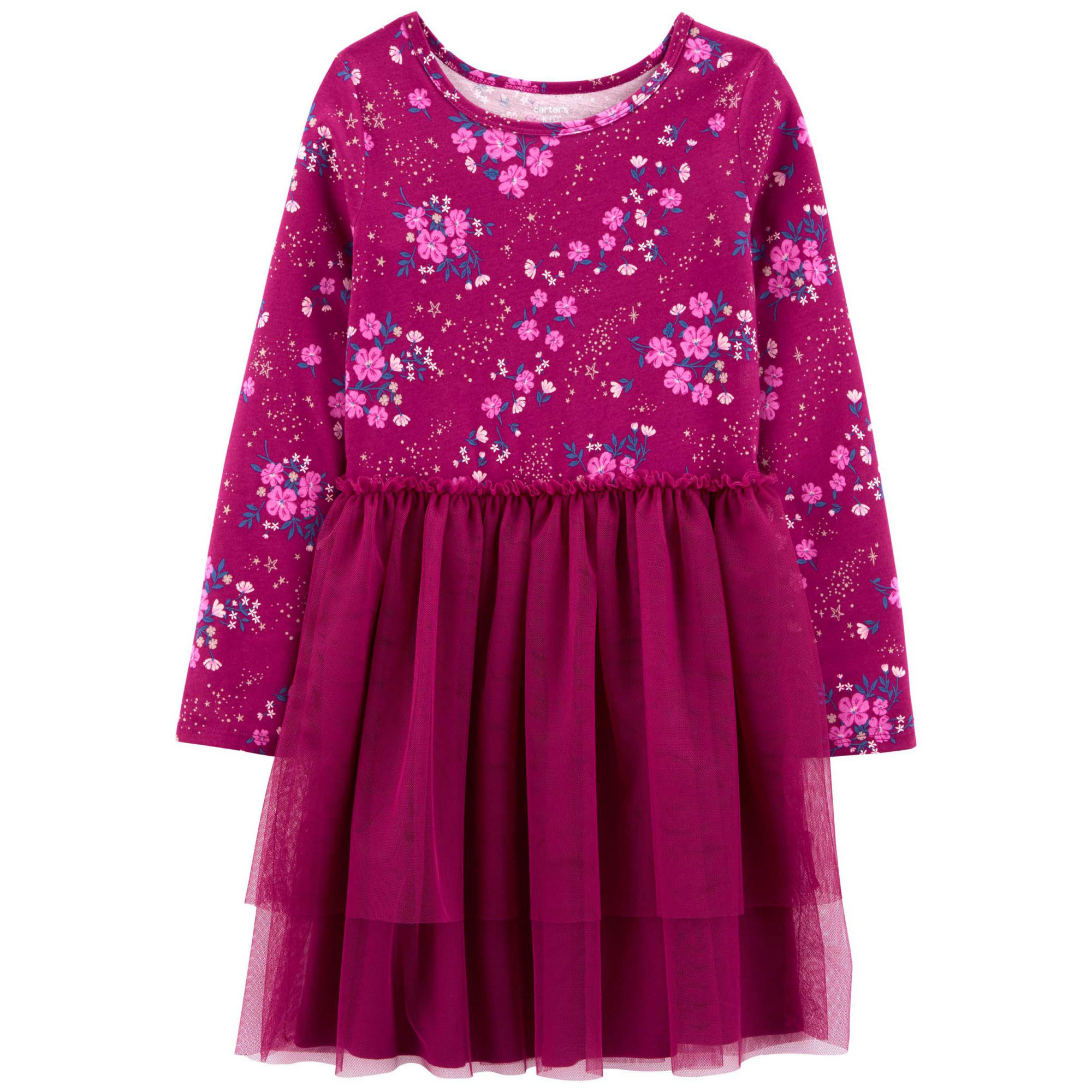 Ця сукня з верхом із джерсі та чарівною багаторівневою спідницею-пачкою ідеально підходить для найближчого свята! Довгі рукави, звужена талія, спідниця-пачка із тюлю. Є окремі трусики на підгузник на маленьких розмірах. 100% бавовняний трикотаж. Спідниця: тюль із 100% поліестеру. Можна прати в пральній машині.